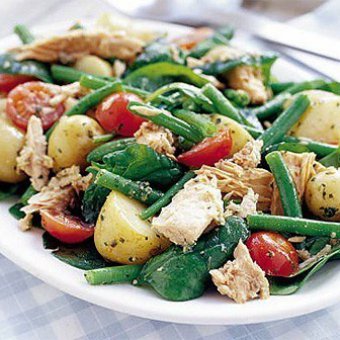 Горячий салат из картофеля, тунца филе в с/с и зеленой фасоли с соусом песто, рецепт: